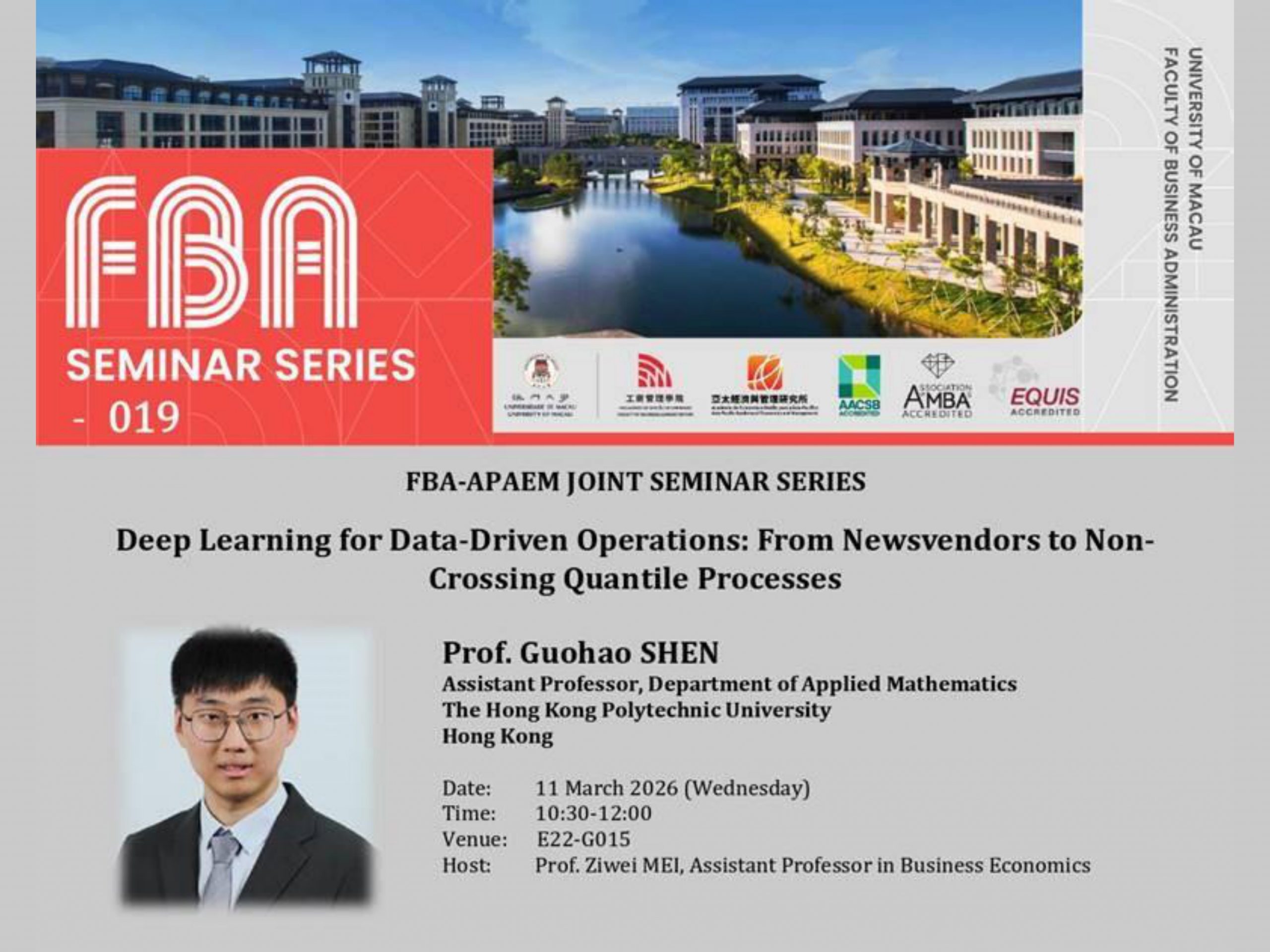 “深度學習在數據驅動運營中的應用:從報童模型到非交叉分位數過程” 講者: 申國豪教授 日期及時間: 11/03/2026 (星期三), 10:30 – 12:00 地點: E22-G015 語言: ...