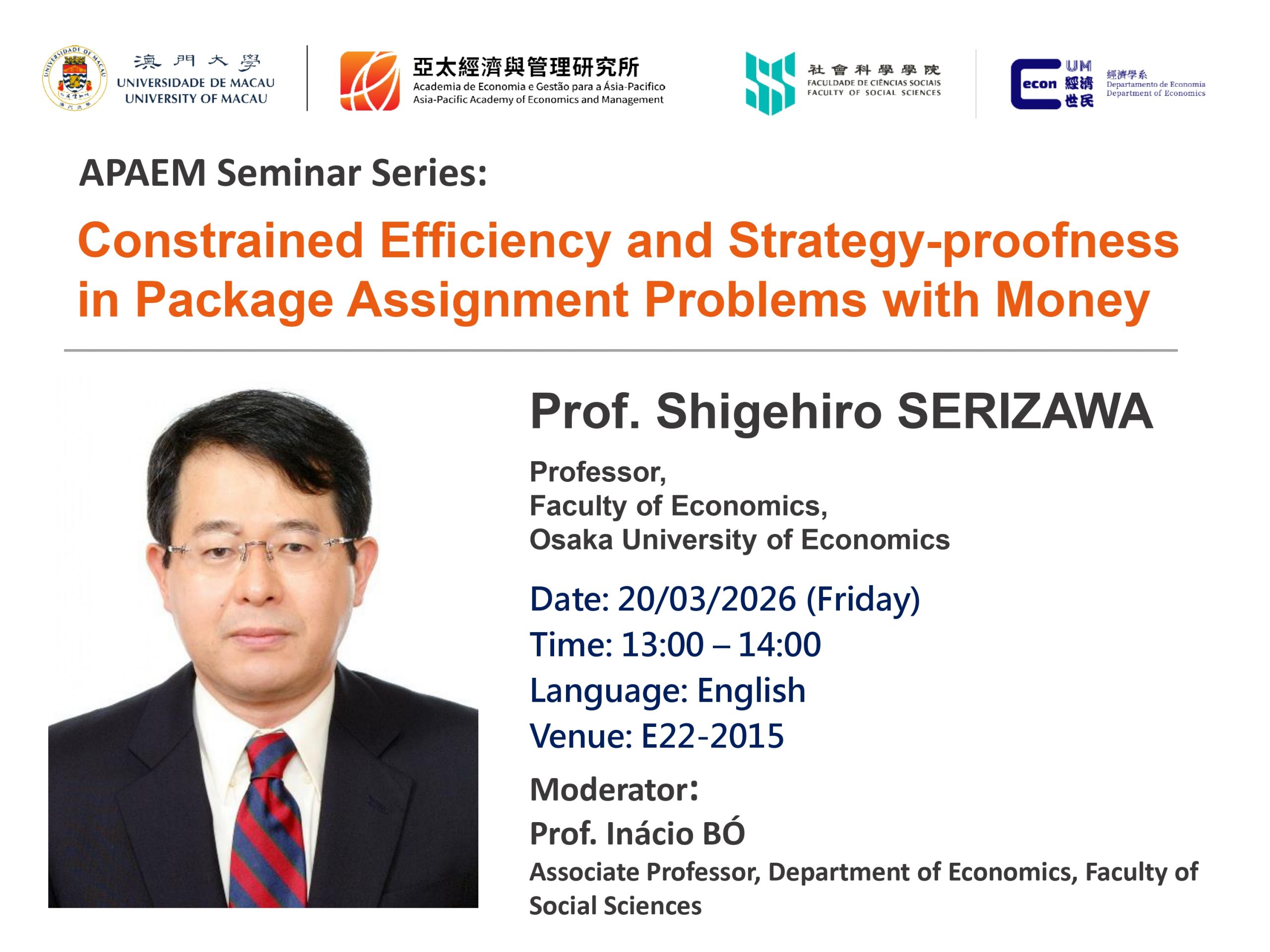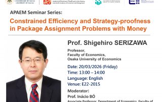 “Constrained Efficiency and Strategy-proofness in Package Assignment Problems with Money” Speaker: Prof. Shigehiro SER ...