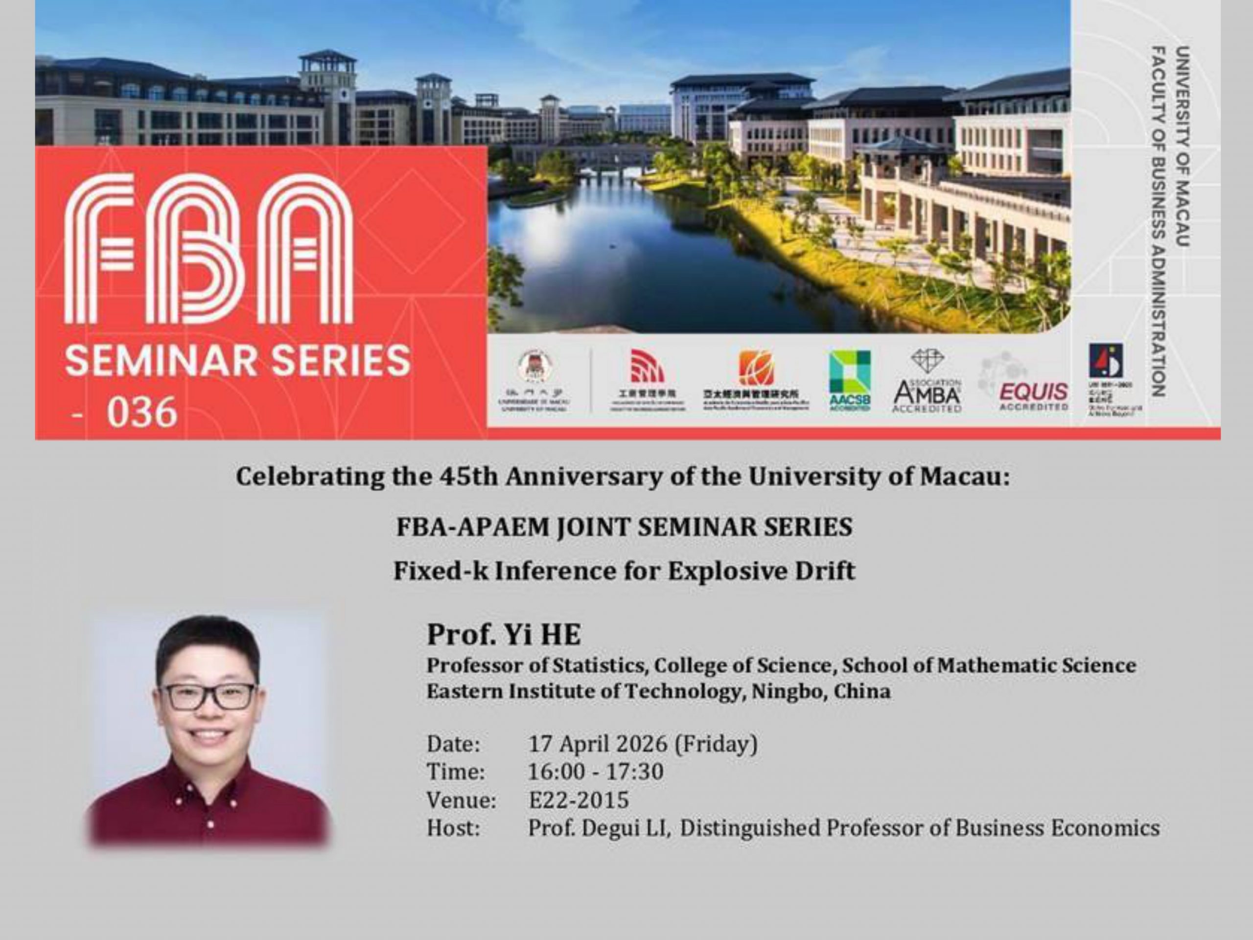 “Fixed-k Inference for Explosive Drift” Speaker: Prof. Yi HE Date and Time: 17/04/2026 (Friday), 16:00 – 17:30 Venue: ...