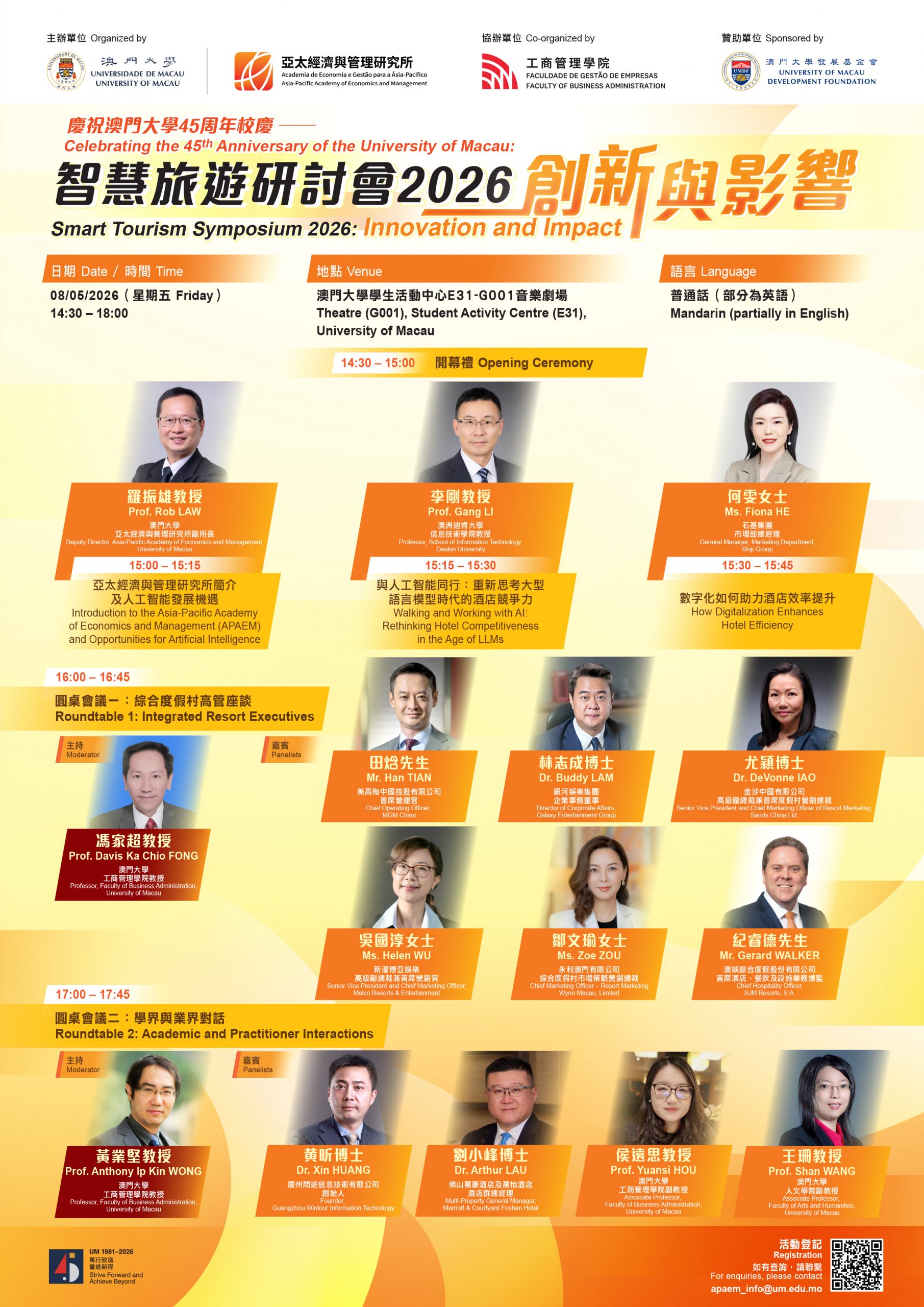 APAEM would like to invite you to our latest event “Celebrating the 45th Anniversary of the University of Macau: Smart Tourism Symposium 2026: Innovation and Impact” on 8 May, 2026 with the following details: