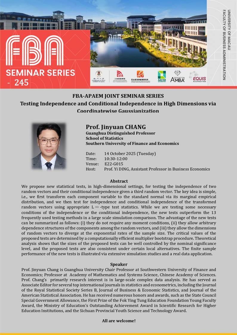 elvachan Chan Hio Cheng2025-10-08T15:02:37+08:002025-10-08|活動| “高維數據中基於坐標高斯化的獨立性與條件獨立性檢驗” 講者: 常晉源教授 日期及時間: 14/10/2025 (星期二), 10:30 – 12:00 地點: E22-G015 語言: 英文 主持人: 丁一教授, 工商管理學院助理教授