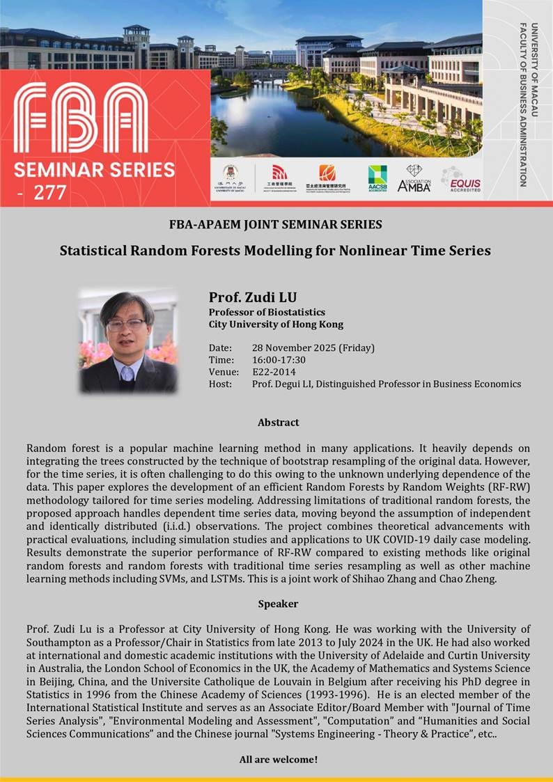 elvachan Chan Hio Cheng2025-11-21T15:43:06+08:002025-11-21|活動| “統計隨機森林模型在非線性時間序列中的應用” 講者: 盧祖帝教授 日期及時間: 28/11/2025 (星期五), 16:00 – 17:30 地點: E22-2014 語言: 英文 主持人: 李德櫃教授, 工商管理學院商業經濟學特聘教授
