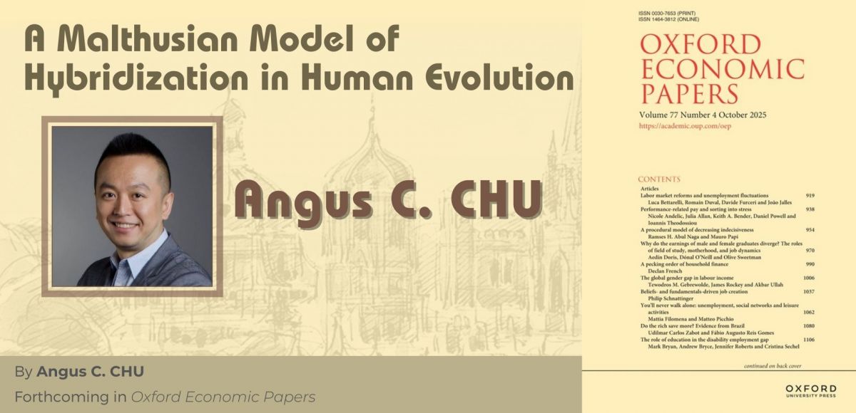 澳大社會科學學院特聘教授、亞太經濟與管理研究所澳門經濟首席研究員朱智豪教授於國際知名期刊《Oxford Economic Papers》發表文章《馬爾薩斯模型中的人類演化(A Malthusian Model of Hybridization in Human Evolution)》。